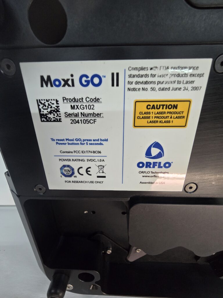 The Moxi GO II™ from Orflo Technologies (a subsidiary of Gemini BioProducts, LLC) is a benchtop flow cytometer analyzer that utilizes a disposable thin-film cassette and a combination of a 488 nm laser, two photomultiplier tubes (525/45 nm filter with either a 561nm LP filter or 646nm/LP filter, user-swappable), Coulter Principle-based cell measurements, and on-board software to provide easy-to- run applications and data analysis.
