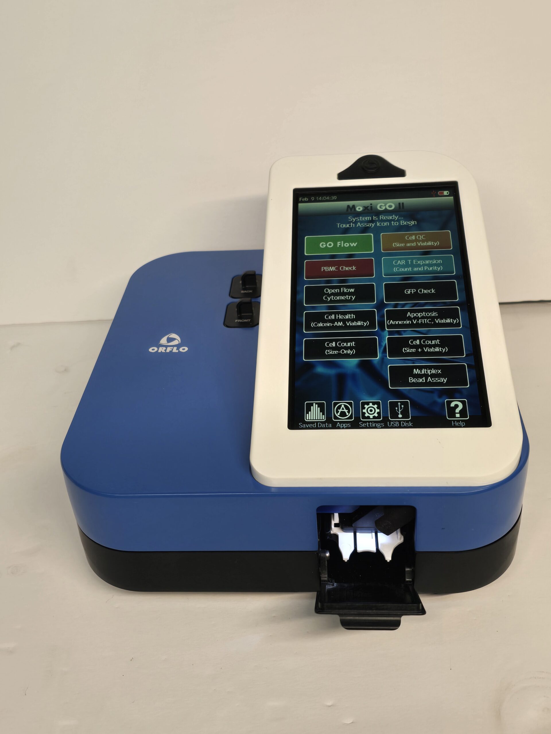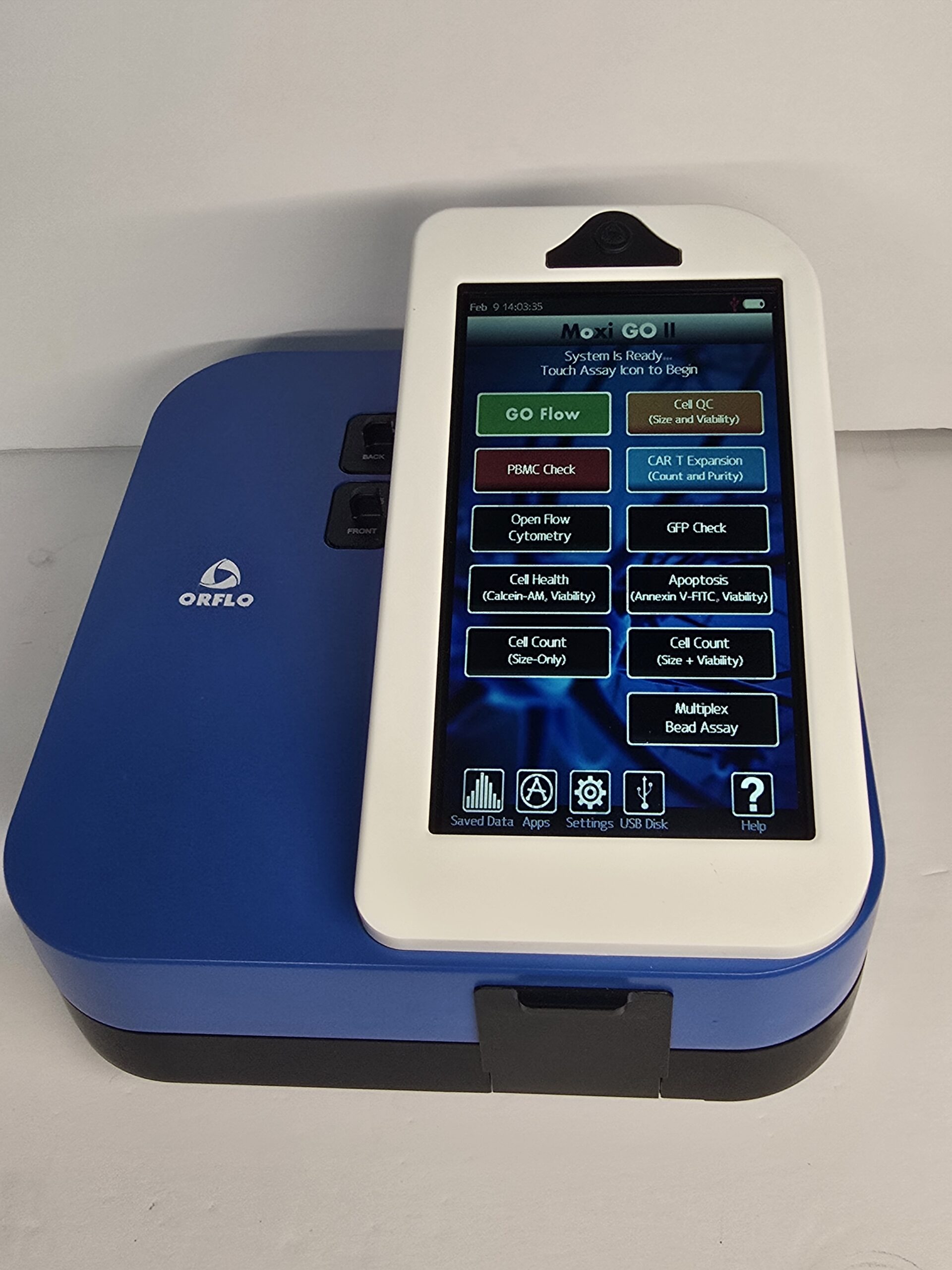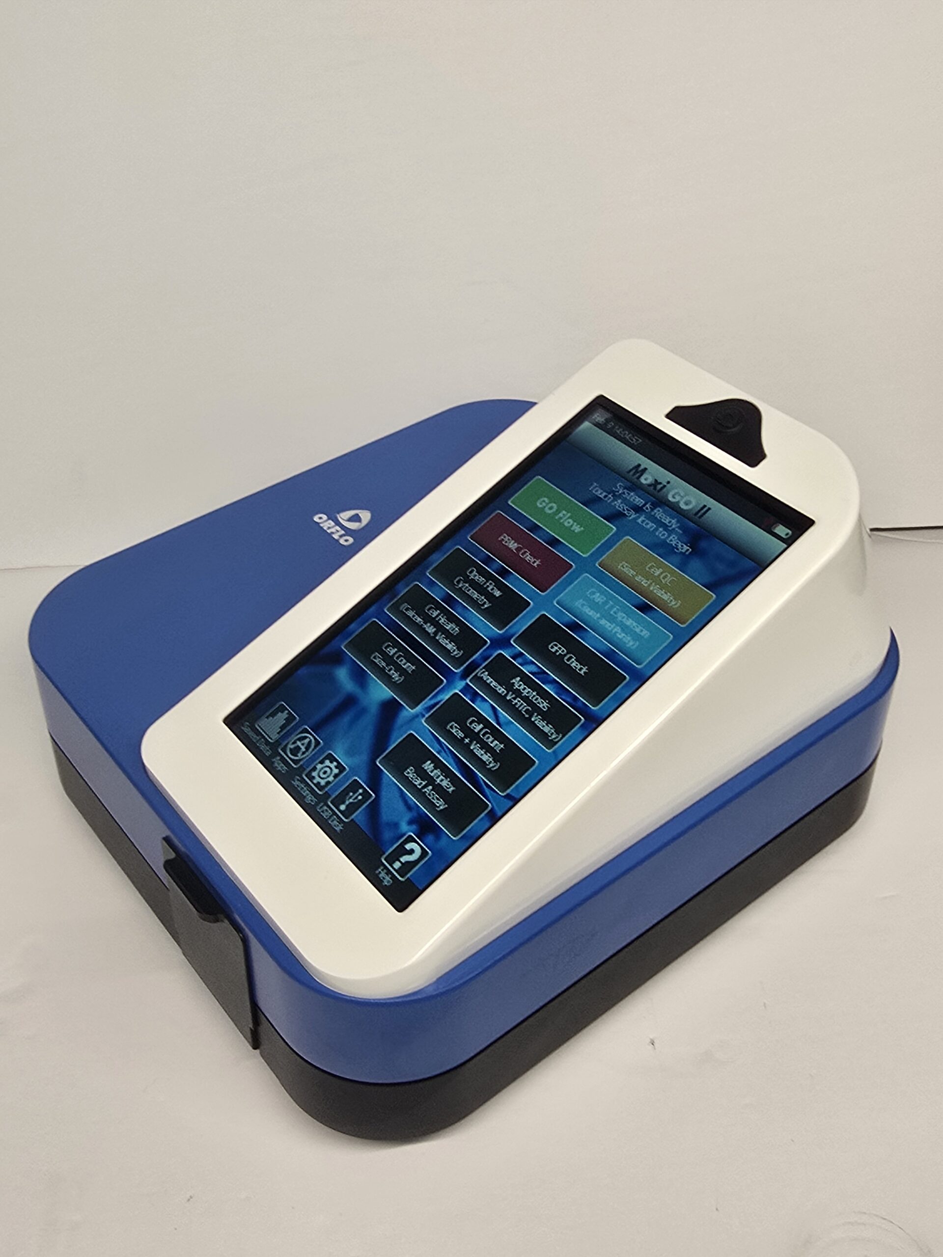 The Moxi GO II™ from Orflo Technologies (a subsidiary of Gemini BioProducts, LLC) is a benchtop flow cytometer analyzer that utilizes a disposable thin-film cassette and a combination of a 488 nm laser, two photomultiplier tubes (525/45 nm filter with either a 561nm LP filter or 646nm/LP filter, user-swappable), Coulter Principle-based cell measurements, and on-board software to provide easy-to- run applications and data analysis.