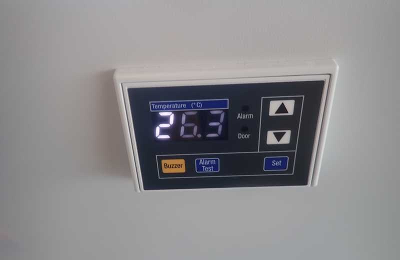 The unit has a door-mounted control with an easy to view LED display that features a preset automatic alarm tracking around the temperature setpoint. The alarm is set at +3°C above and below setpoint, consistent with vaccine and high-value product storage requirements.